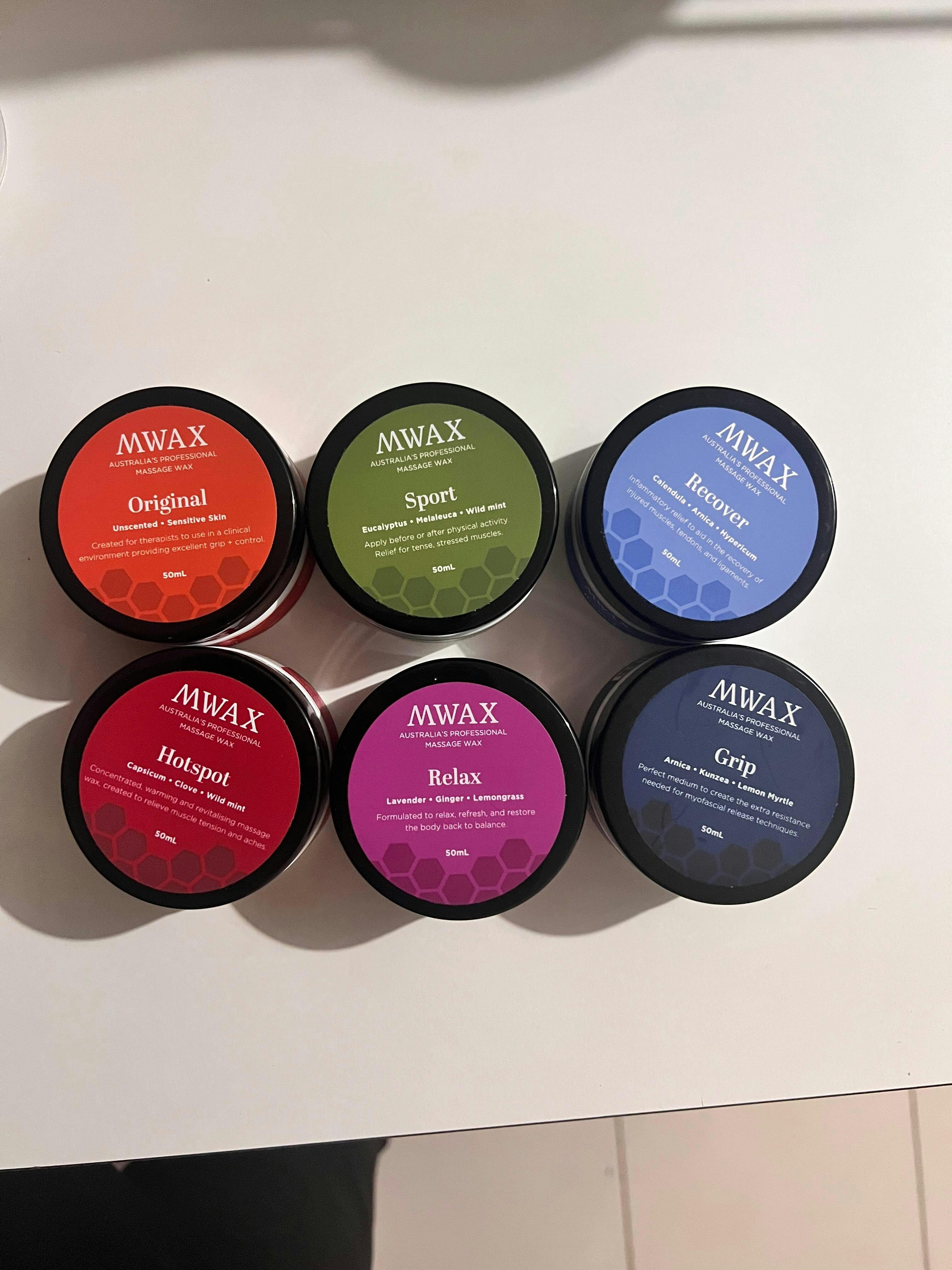 Large size contains: 1x MWax Original (400mL), 1x MWax Recover (400mL), 1x Wax Sport (400mL), 1x MWax Relax (400mL),1x MWax Hotspot (50mL), 1 x MWax Grip (50mL)